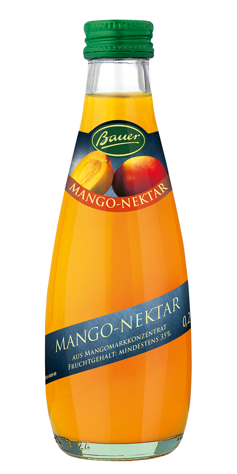 Gelb-orange-rote vollreife Mangos geben dem Bauer Mangonektar seinen unverwechselbar süßen Geschmack. Die exotische Frucht ist längst eine der wichtigsten Cocktailzutaten geworden und schmeckt pur, mit Sekt oder auch als Mango-Milch traumhaft gut.Fruchtgehalt: mindestens 35 %